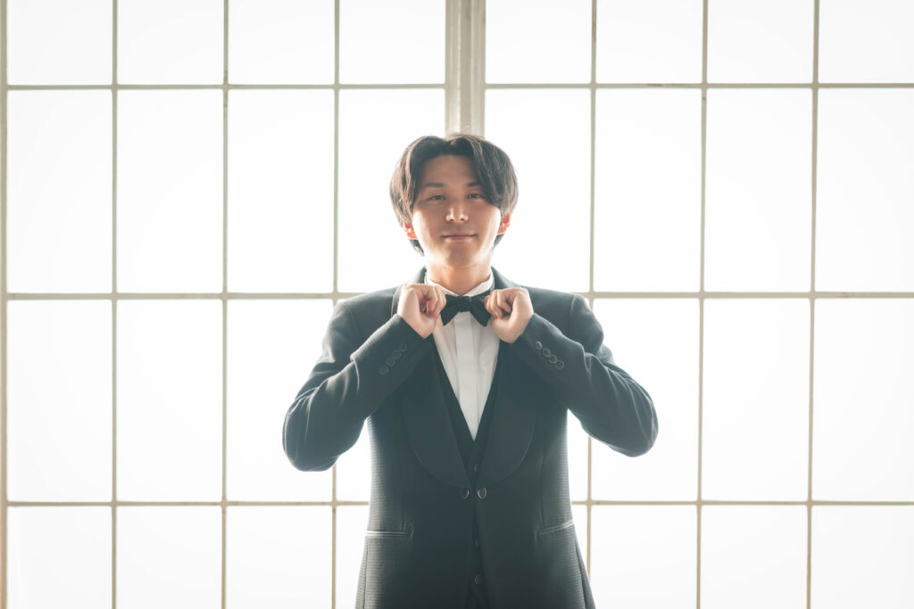 写真が苦手とは思えない新郎様のこのカッコよさ。新婦様のリラックスした表情も自然でとても素敵なショットです。
